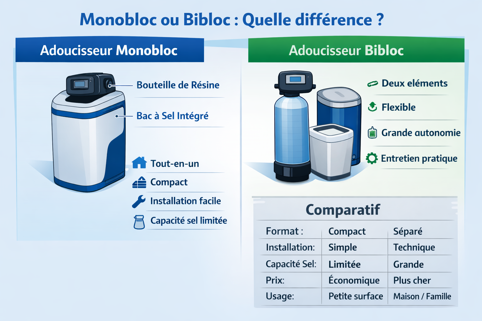 À retenirEn termes de qualité d’adoucissement, un monobloc et un bibloc peuvent être aussi efficaces. Le choix dépend surtout de la place disponible, de la consommation d’eau et du niveau de confort recherché. Quel choix faire ?Le monobloc convient très bien pour une installation simple, compacte et économique. Le bibloc est souvent préférable pour une maison avec plus de consommation, davantage d’autonomie et un entretien plus confortable. ![]() |