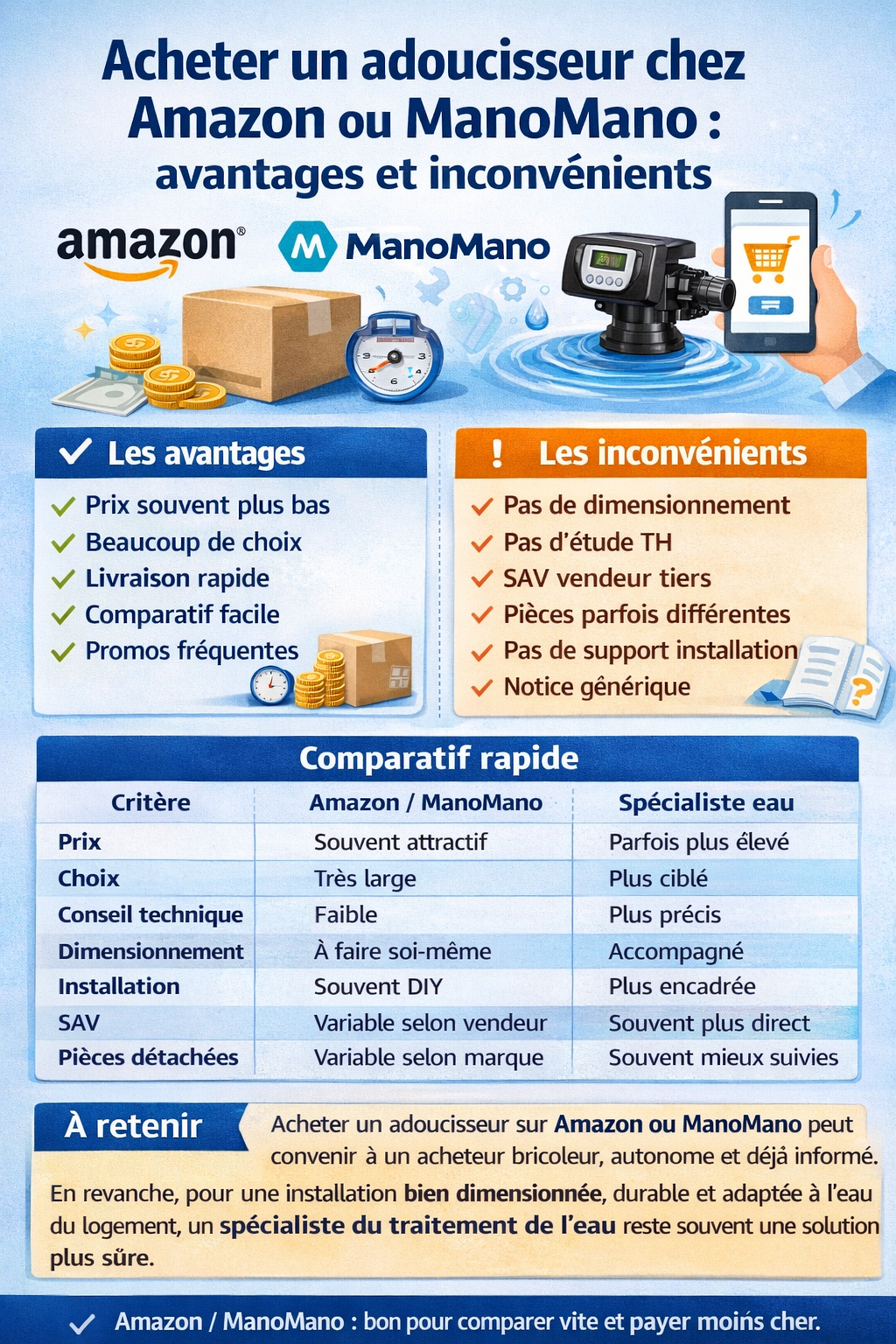 Acheter un adoucisseur chez Amazon ou ManoMano : avantages et inconvénientsAcheter un adoucisseur d’eau sur Amazon ou ManoMano peut sembler pratique, rapide et économique. Ces plateformes proposent un large choix de modèles, souvent à des prix attractifs. Mais en contrepartie, l’acheteur doit souvent gérer seul le choix du modèle, le dimensionnement, l’installation et parfois même le service après-vente. Les avantages