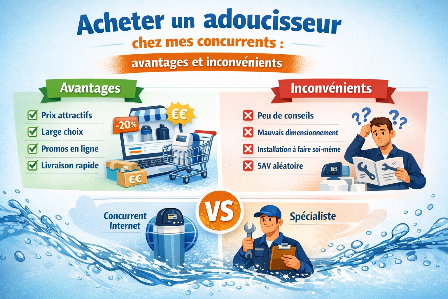 Acheter un adoucisseur chez mes concurrents : avantages et inconvénientsAcheter un adoucisseur d’eau chez un concurrent sur internet peut sembler intéressant grâce à des prix attractifs, un large choix de modèles et une commande rapide. Pourtant, derrière un tarif séduisant, il existe souvent plusieurs limites : manque de conseil technique, dimensionnement approximatif, choix de la vanne ou du débit laissé au client, et service après-vente parfois variable selon le site ou le vendeur. Les avantages d’acheter chez un concurrent sur internet